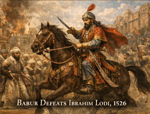 In 1526, Babur defeated Ibrahim Lodi in the First Battle of Panipat, ending the Delhi Sultanate and establishing the Mughal Empire, which would rule India for the next several centuries.